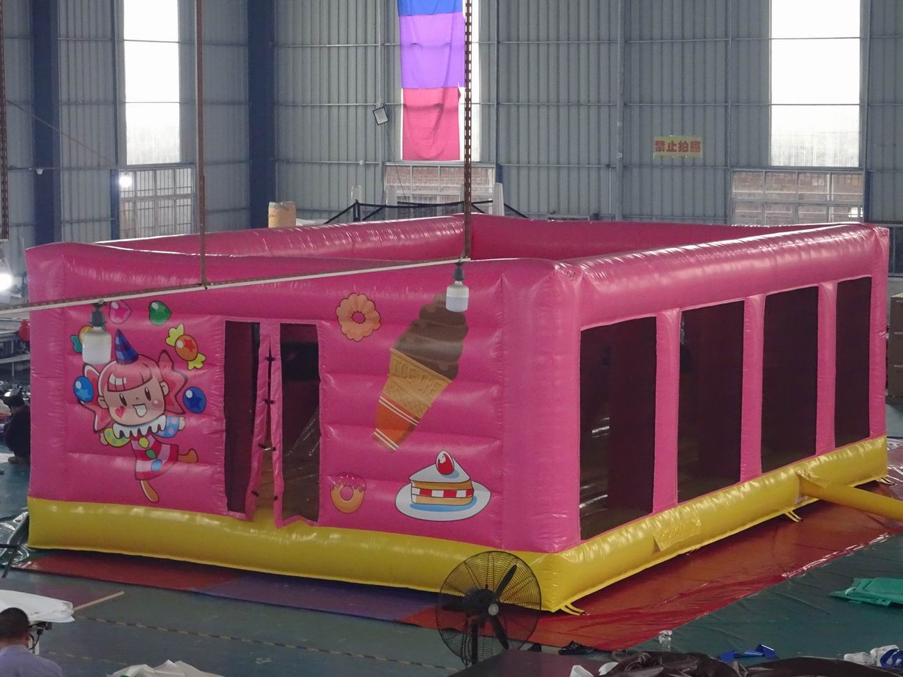 エア遊具新商品 屋内向けプレーランド 2019年3月20日 kansaisa 屋内遊園施設様むけにお菓子がテーマのプレーランドが完成しました。 目立つピンクの壁にたくさんのプリントと中にはお菓子のオブジェが配置されています。 スピードガン・エア遊具の関西エスアンドエー