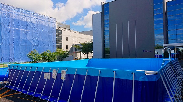 パイププールのメリットは空気で膨らませないので耐久性に優れています、またシートに穴が開いたとしても水漏れ防止のテープで簡単に補修が可能です。よって災害現場で非常に役立つプールです。(その分、組立には時間がかかります。)