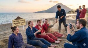 そこで「温泉」と言う非常に撮影と相性が悪い施設ではありますが砂蒸し風呂に「撮影OKな専用エリア」を設けて、またそのエリアの服を浴衣からはだけにくい作務衣(上下別)などに変えて運営すれば世界でも珍しい天然の砂蒸し風呂の体験に多くのインバウンド客が指宿そして鹿児島にも立ち寄りそうです。