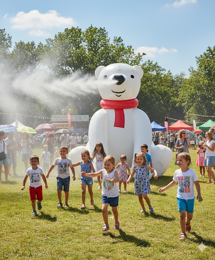 こちらの製品は密封式になるので一度空気(エアポンプ)で膨らませると後は水道に繋げれば鼻の先からミストを噴射して涼しい空間を演出します。