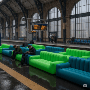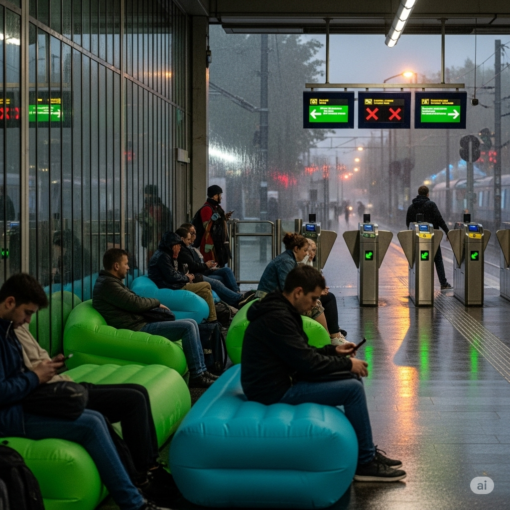 駅だけでなく駅周辺のオフィスビルなどに協力をしてもらってエントランスロビーを開放してエアベンチを仮設すれば多くの人が今よりも快適に過ごせるかと思います。