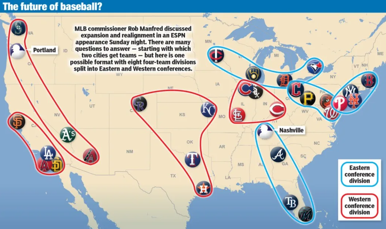 拡張に伴い再編後のMLBがどのようなものになるかについて未定ですが、NBAやNHLのようにイースタン・カンファレンスとウェスタン・カンファレンスに分かれ、各カンファレンスに16チームずつが所属する形式になる可能性もあるようです。