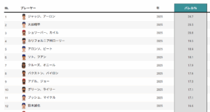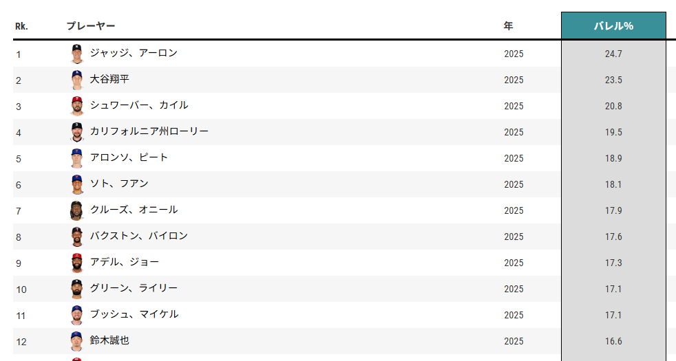 2025年度のMLBの打球速度ランキング(上位50データの平均で算出)です。