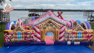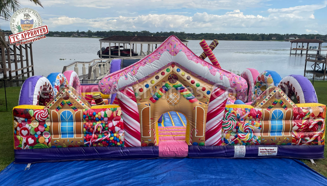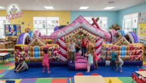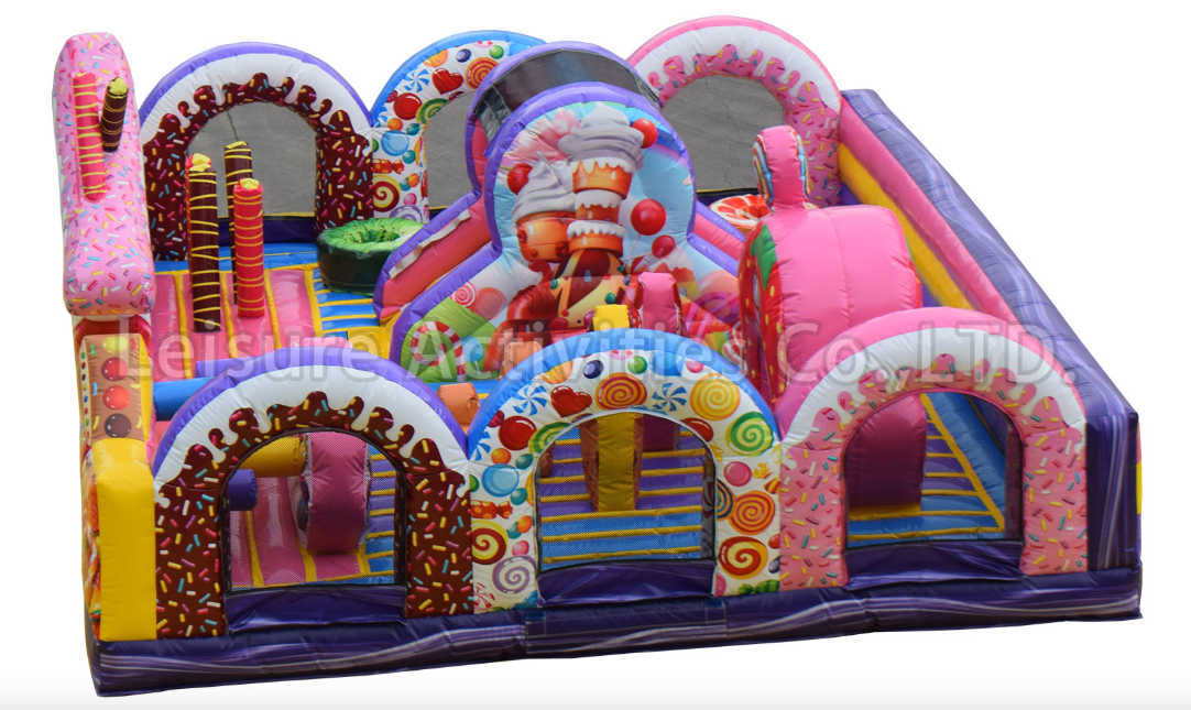 エア遊具新商品 キャンディープレーランド 2025年11月19日 kansaisa 前回のアニマルプレーランドに続いてレジャーアクト社のお菓子のプレーランドが完成しました。 こちらのレンタルも下記ワンステップまで直接お願いいたします。 スイーツキッズコンボ **** イメージ図(AI):高さが低いので天井高の低い屋内などで役立つデザインです。 スピードガン・エア遊具の関西エスアンドエー