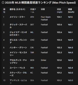 今回はドジャースの劇的な優勝で大盛り上がりした2025年度のMLBの投手の球速ランキング(Gemni Deep searchより) です。