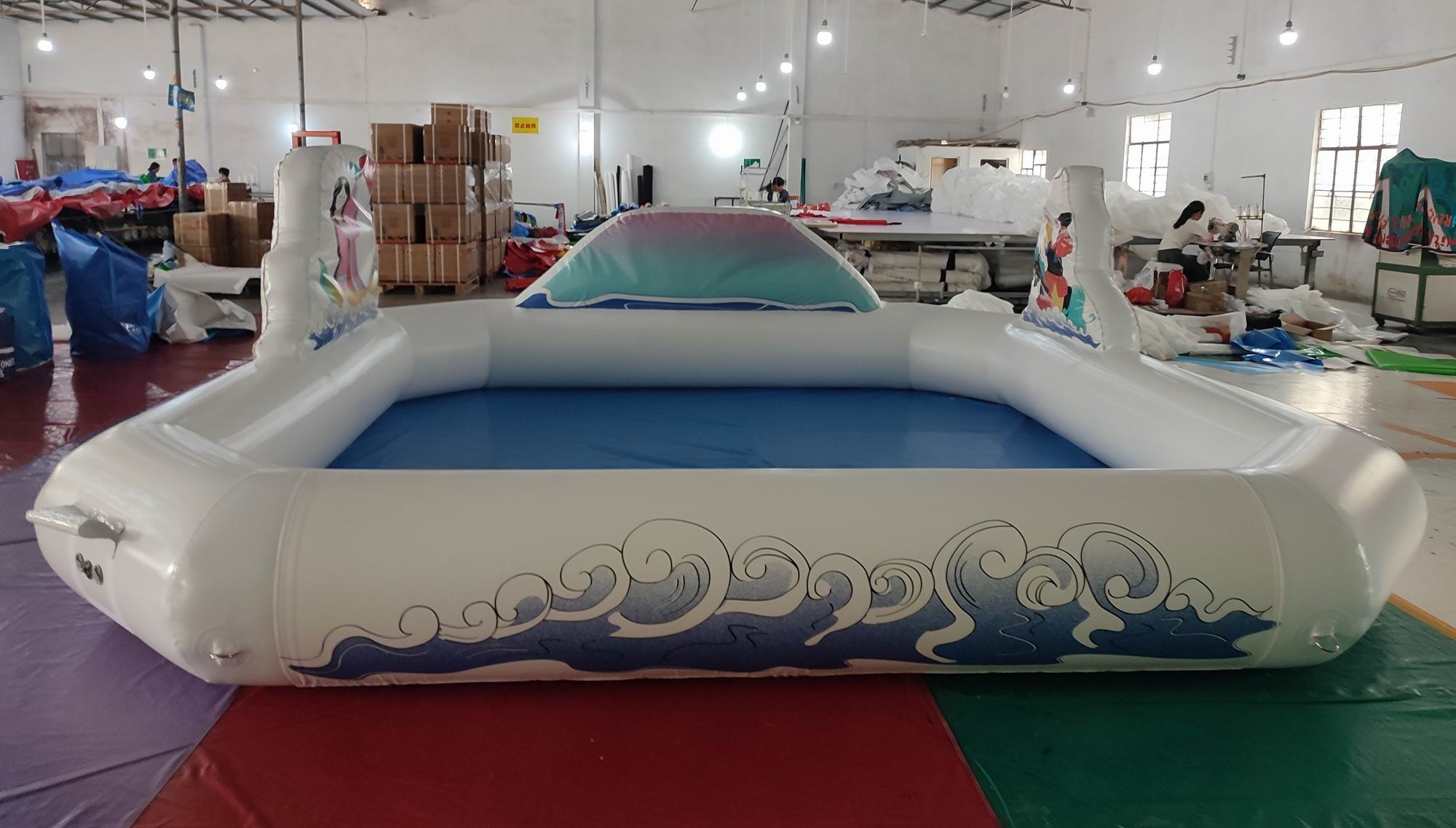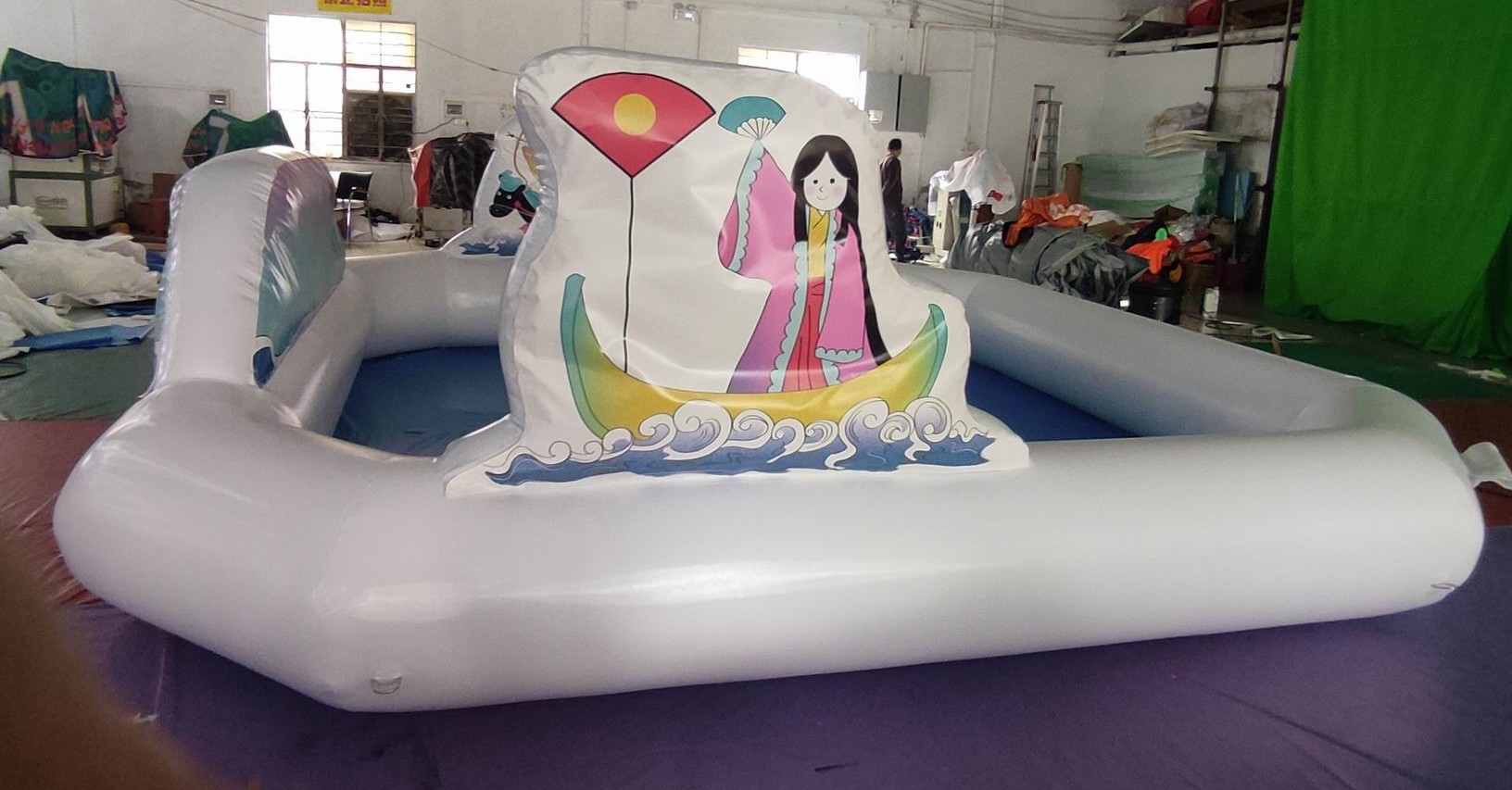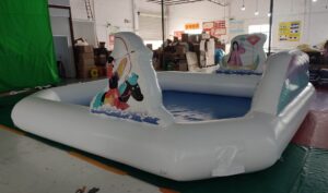 通常は密封式のプールの場合はデコレーションはつけませんが今回はデータをプリントして膨らませています。