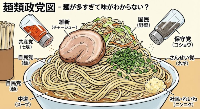 汁なし高市麵か?立憲薄味スープか?こってり創価スープか?チャーシュー麺に野菜ラーメン、ネギはサービス入れ放題?薬味を入れすぎると・・・みらいつけ麺もありそうですね。(笑)