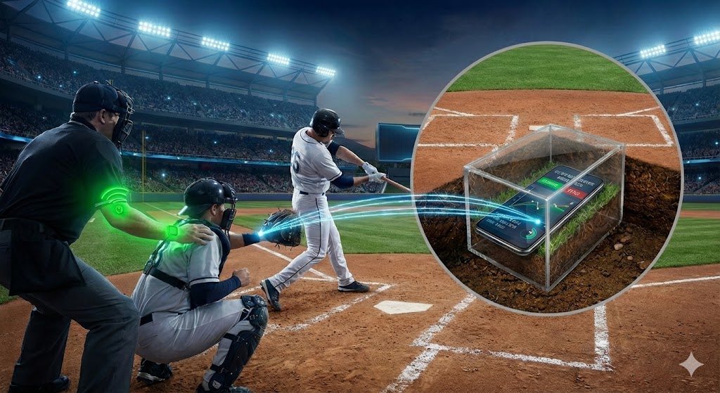 ★スマホ審判(ストライク/ボール判定機)さらに、このシステムは「スマホ審判」としても活用可能です。地中に埋設したスマートフォンで、バッターの立ち位置と通過するボールを同時に撮影。AIがストライク・ボールを瞬時に判定し、審判へ伝達します。あわせてスコアラーには球種などの詳細データも共有できるため、試合運営の質を劇的に向上させます。