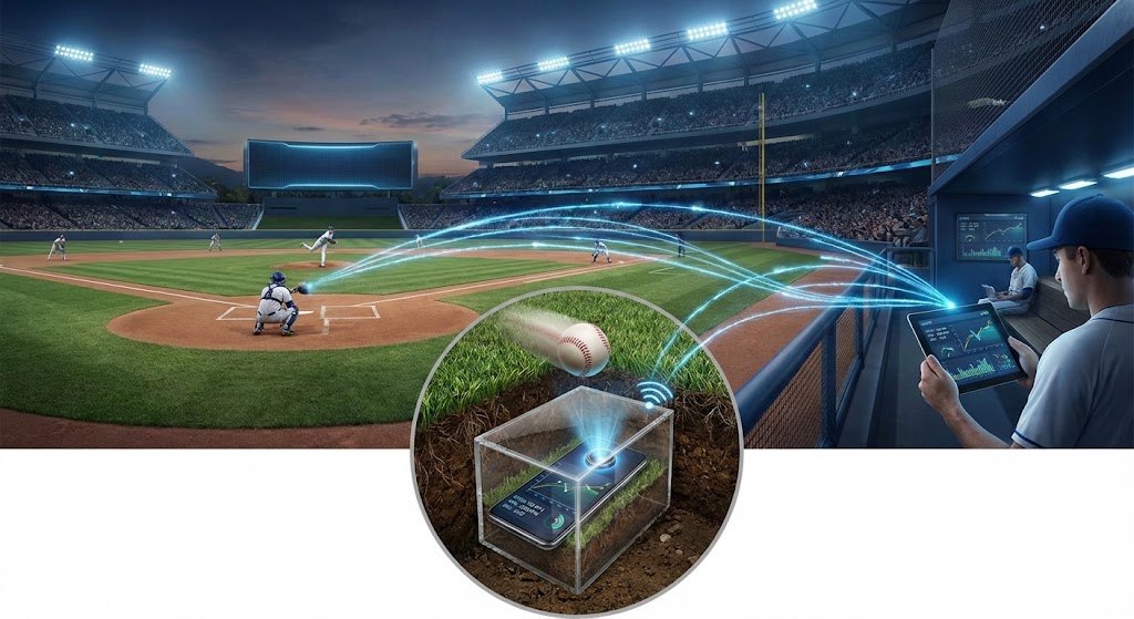 ★地中埋め込み式スピードガン(スマホアプリ)※ピッチャーとキャッチャーの間の地中に、防護ケースに入れたスマートフォンを埋設。その上を通過するボールを撮影し、AIで即座に画像解析を行います。球速、回転数、回転軸などのデータは、リアルタイムでスコアラーへ転送。練習から実戦まで、あらゆるシーンで手軽に計測が可能です。