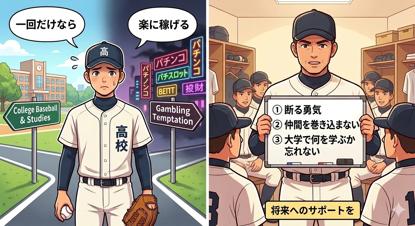 ①大学で野球を継続する、しないに関わらず同級生や先輩などからのギャンブルの誘いは断る。もしくはそういった危険性を十分に理解して参加する。