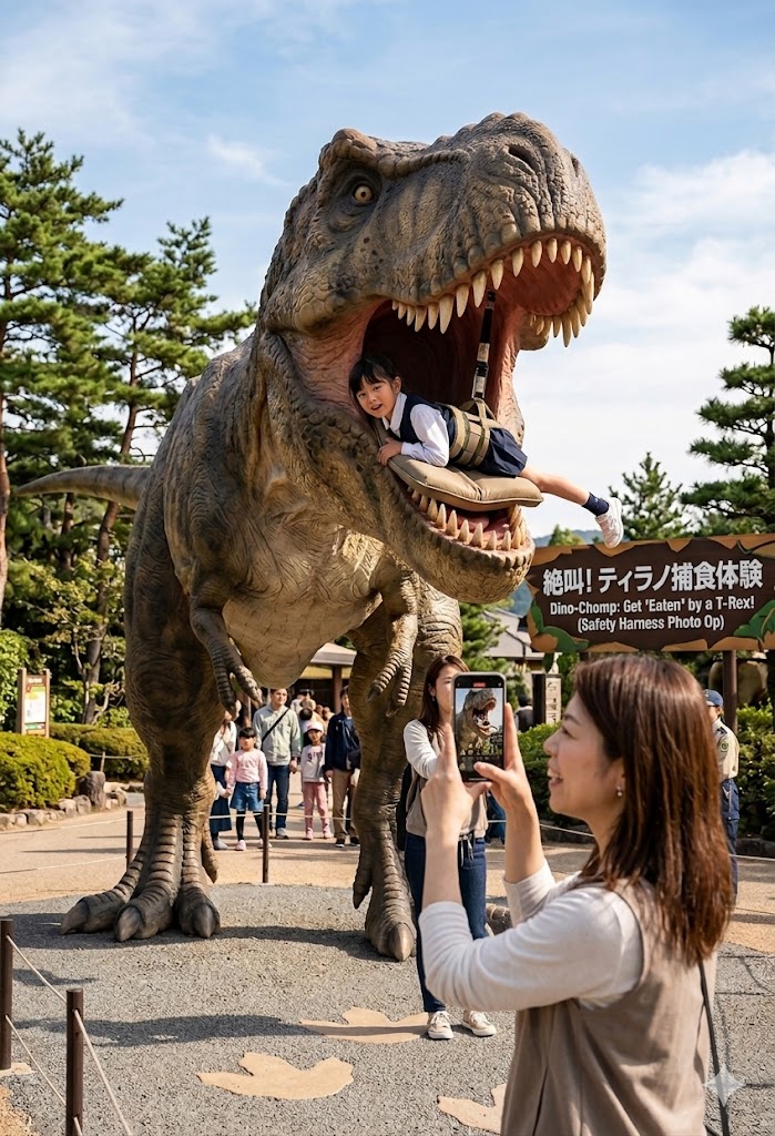 今のジャングリアの恐竜での一番の売り(SNS拡散)は「隊長が恐竜に食べられる」シーンだと思いますが誰が撮っても同じ写真なのでおもしろくありません。そこで来場者自信が恐竜に食べられるアトラクション(中国製だと数百万)を導入することでSNS拡散で世界に認知度が高まります。