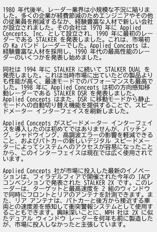 1992年の創業以来、Stalker Sport(アプライドコンセプト社)は正確で信頼性の高い速度測定の業界標準となっています。Pro Sシリーズは、回転数を測定できる唯一のハンドヘルドスポーツレーダーです。Pro 3s、Pro 3、またはSport 3をご利用のチームは、レーダーをAWREシステムにシームレスに接続し、放送中に投球速度を表示したり、AWREの高度なチャートシステムに記録したりできるようになりました。