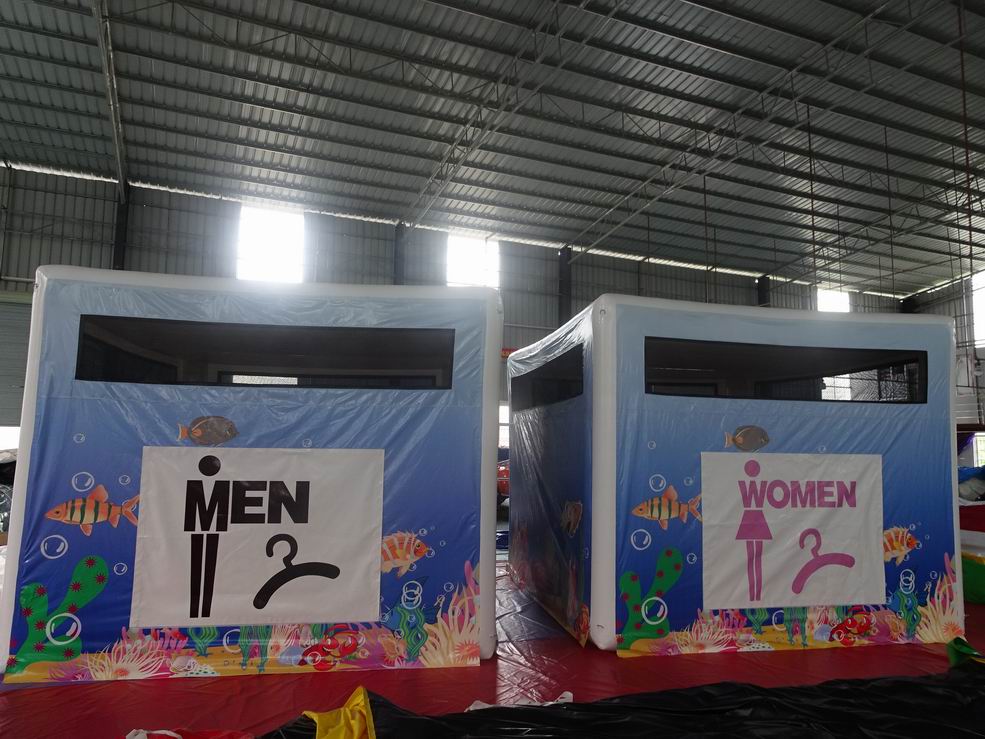 夏のイベントでの移動式プールやウォータースライダーの運営にあわせて設置できる密封式(電気不要)の更衣室です。